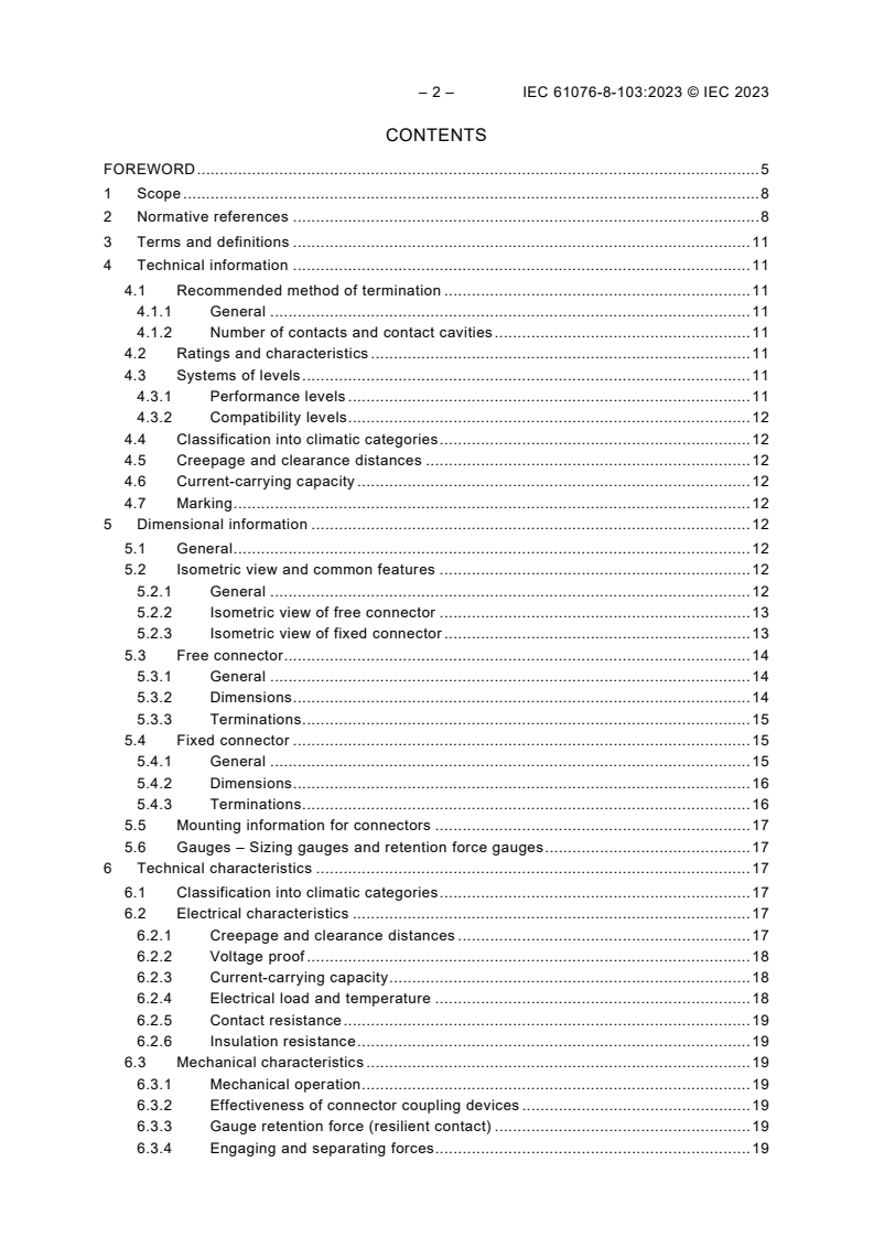 This standard provides comprehensive details including overall and interface dimensions, technical and mechanical characteristics, performance requirements, and prescribed testing methods. It targets manufacturers, designers, and users of electrical connectors who require standardized components compliant with international safety and performance criteria.