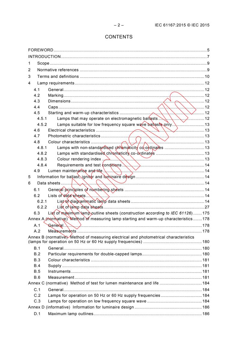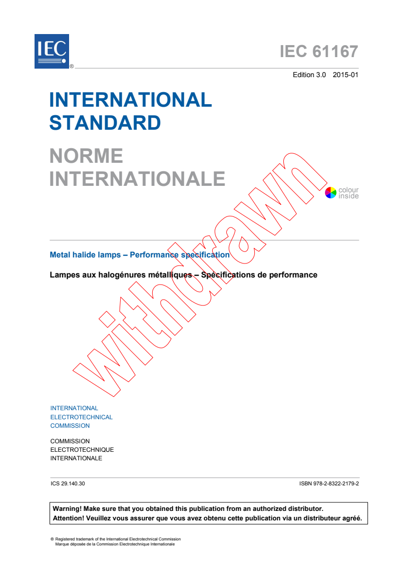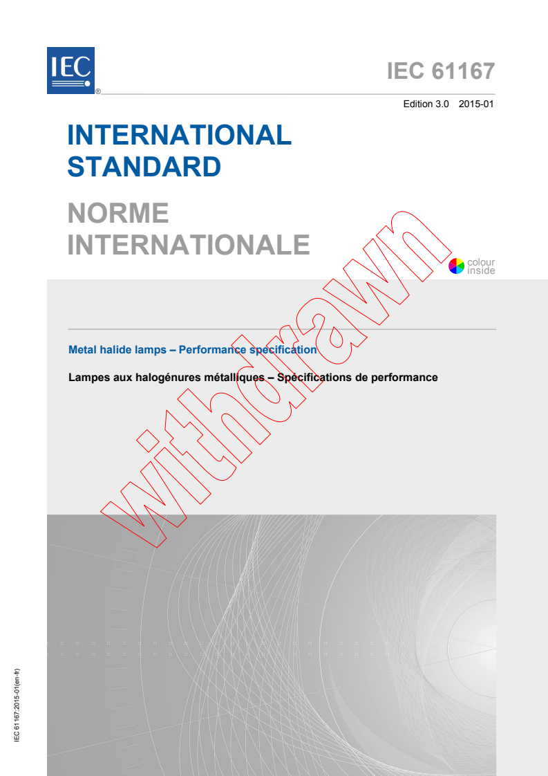 IEC 61167:2015 specifies the performance requirements for metal halide lamps for general lighting purposes. This third edition replaces the second edition published in 2011. This third edition constitutes a technical revision. This edition includes the following significant technical changes with respect to the previous edition.