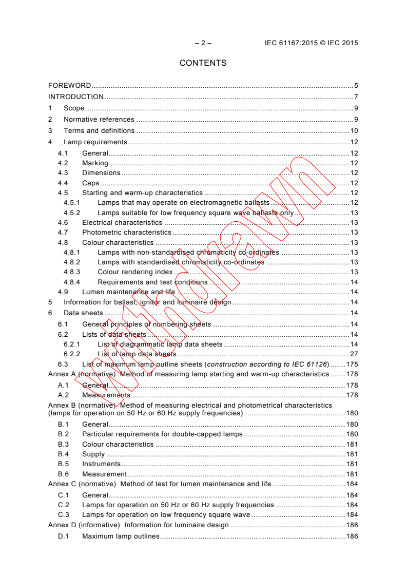 IEC 61167:2015 specifies the performance requirements for metal halide lamps for general lighting purposes. This third edition replaces the second edition published in 2011. This third edition constitutes a technical revision. This edition includes the following significant technical changes with respect to the previous edition. a) A set of new lamp data sheets (20 W, 35 W, 50 W, 100 W) is introduced. b) Reference to ILCOS (International lamp coding system) is removed from the lamp data sheets and now located in a new annex. c) Information on outer bulb temperature (and in some cases also on pin temperature and temperature adjacent to cap) is replaced with an explanation on differences in manufacturers' construction; this explanation is given in detail in a new annex.