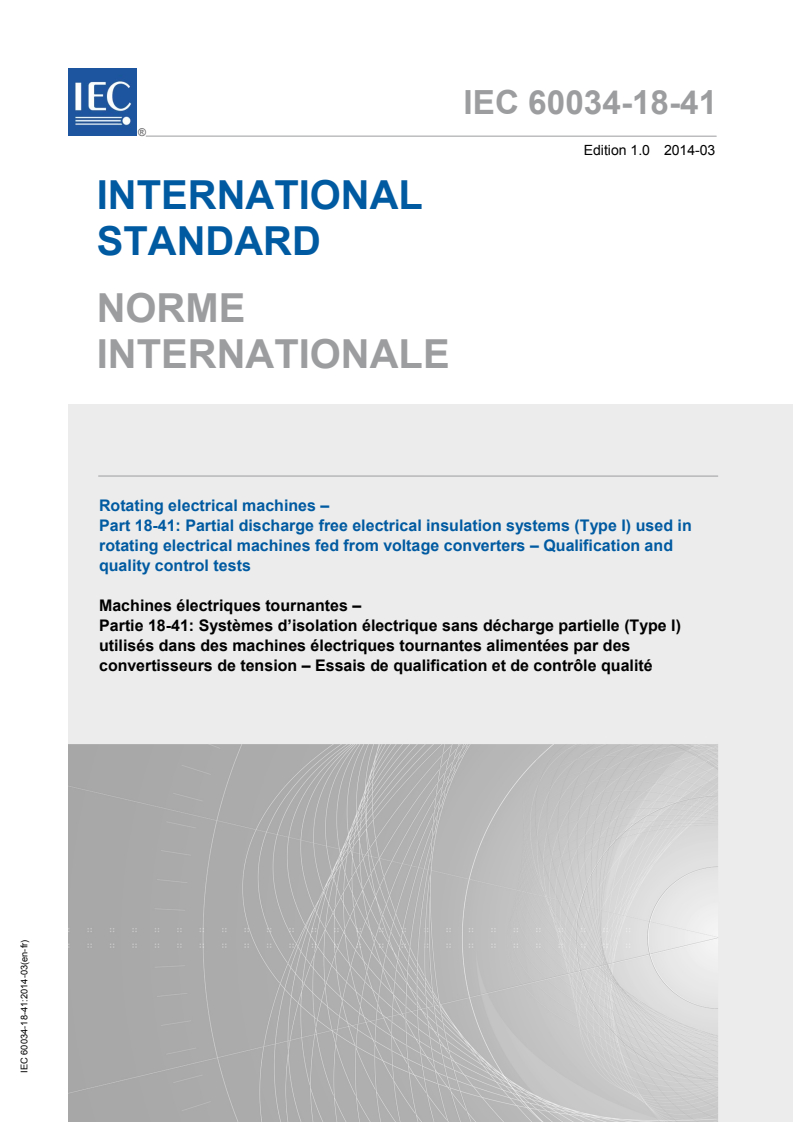 IEC 60034-18-41:2014 is an international standard published by the International Electrotechnical Commission (IEC) that focuses on partial discharge free electrical insulation systems (Type I) used in rotating electrical machines powered by voltage converters. This standard establishes qualification and quality control test procedures for the insulation systems of stator and rotor windings in AC rotating electrical machines, including single-phase and polyphase machines. It specifically addresses machines operated with voltage-source pulse-width-modulation (PWM) drives, a common type of converter operation.