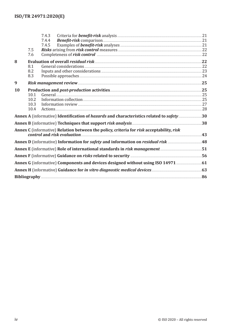 - Informative annexes - practical techniques for analysis, guidance for IVDs (Annex H), security-related risks (Annex F), use of standards in risk management (Annex E), and communication of residual risk.