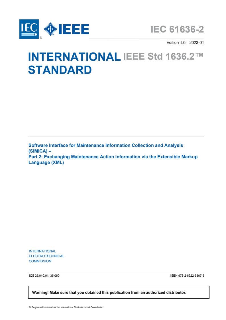 IEC 61636-2:2023 is a standard published by the International Electrotechnical Commission (IEC). Its full title is "Software Interface for Maintenance Information Collection and Analysis (SIMICA) - Part 2: Exchanging Maintenance Action Information via the Extensible Markup Language (XML)". This standard covers: IEC 61636-2:2023 (E) provides the definition of an exchange format, utilizing XML, for exchanging maintenance action information (MAI) associated with the removal, repair, and replacement of system components to maintain/support an operational system. This standard is published as a double log IEC-IEEE standard.
