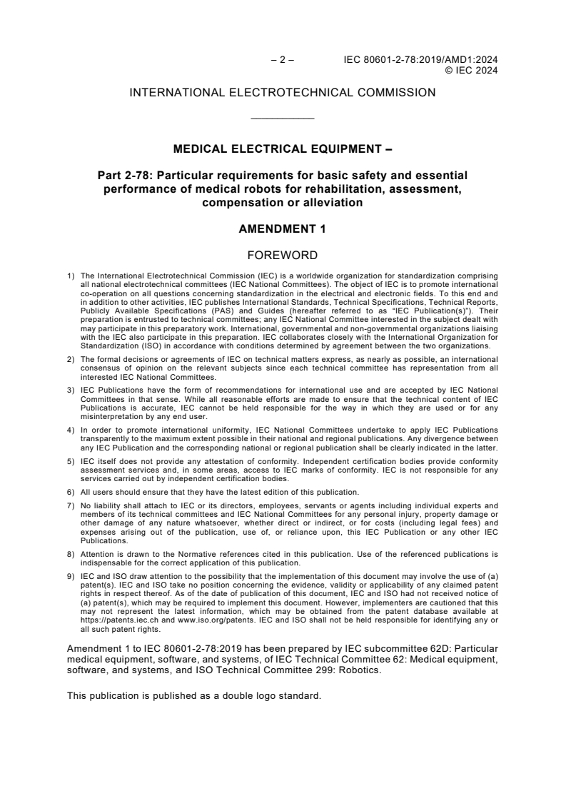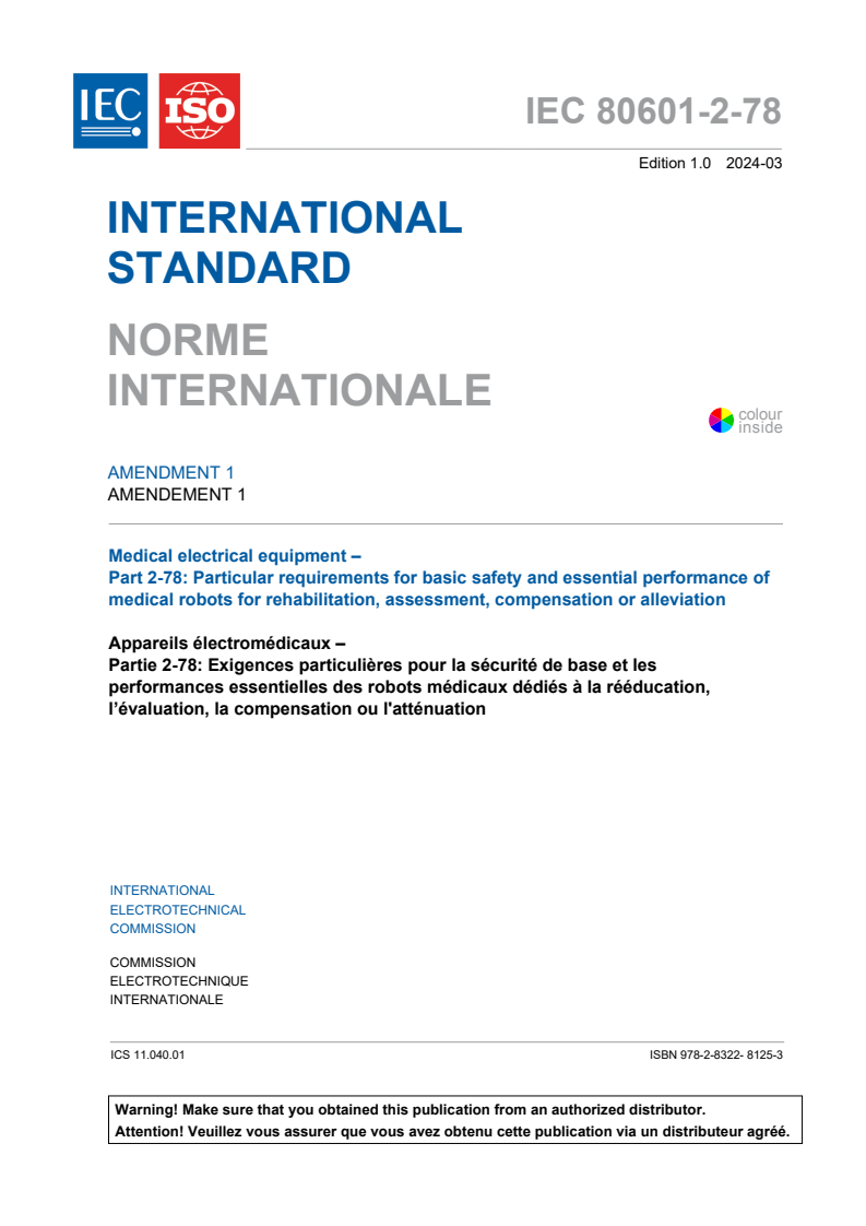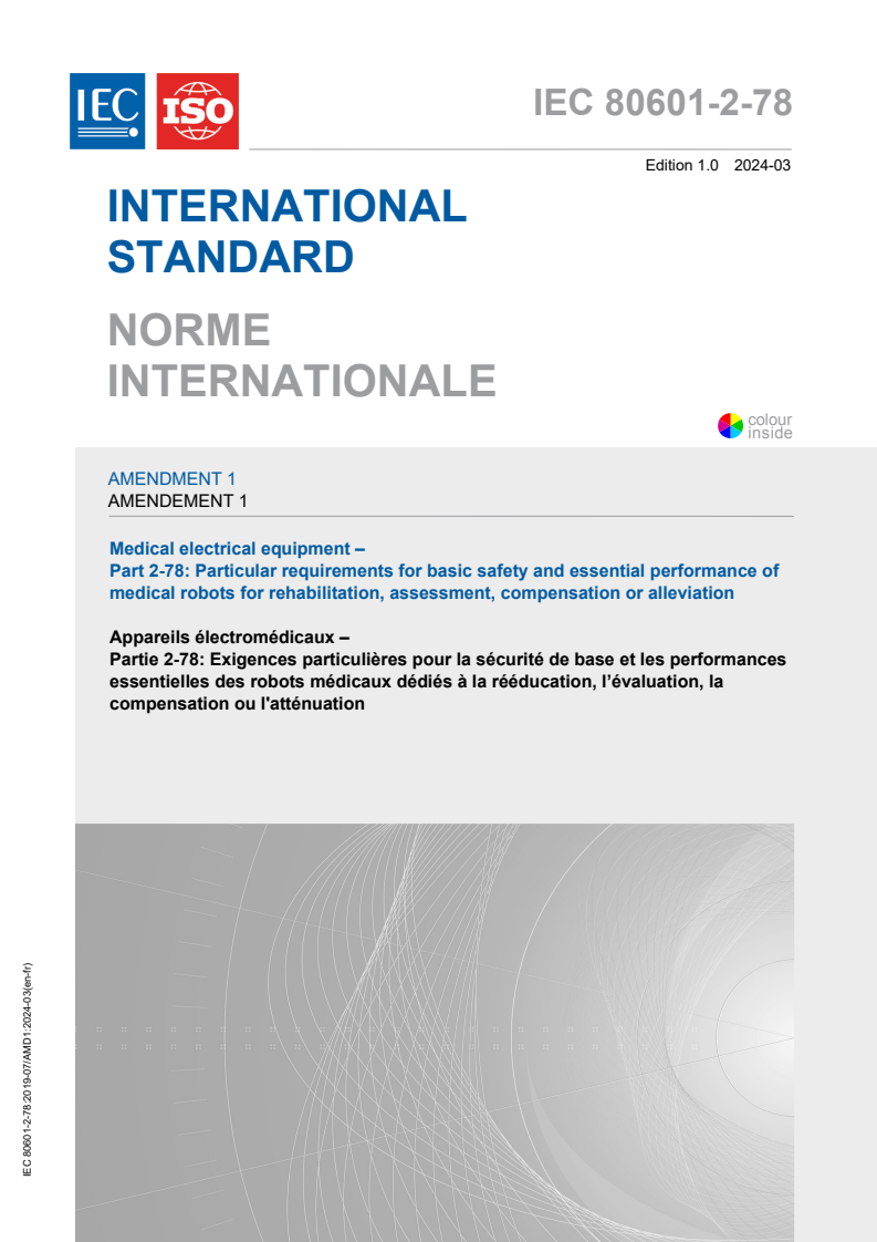 IEC 80601-2-78:2019/AMD1:2024 is a standard published by the International Electrotechnical Commission (IEC). Its full title is "Amendment 1 - Medical electrical equipment - Part 2-78: Particular requirements for basic safety and essential performance of medical robots for rehabilitation, assessment, compensation or alleviation". This standard covers: Amendment 1 - Medical electrical equipment - Part 2-78: Particular requirements for basic safety and essential performance of medical robots for rehabilitation, assessment, compensation or alleviation