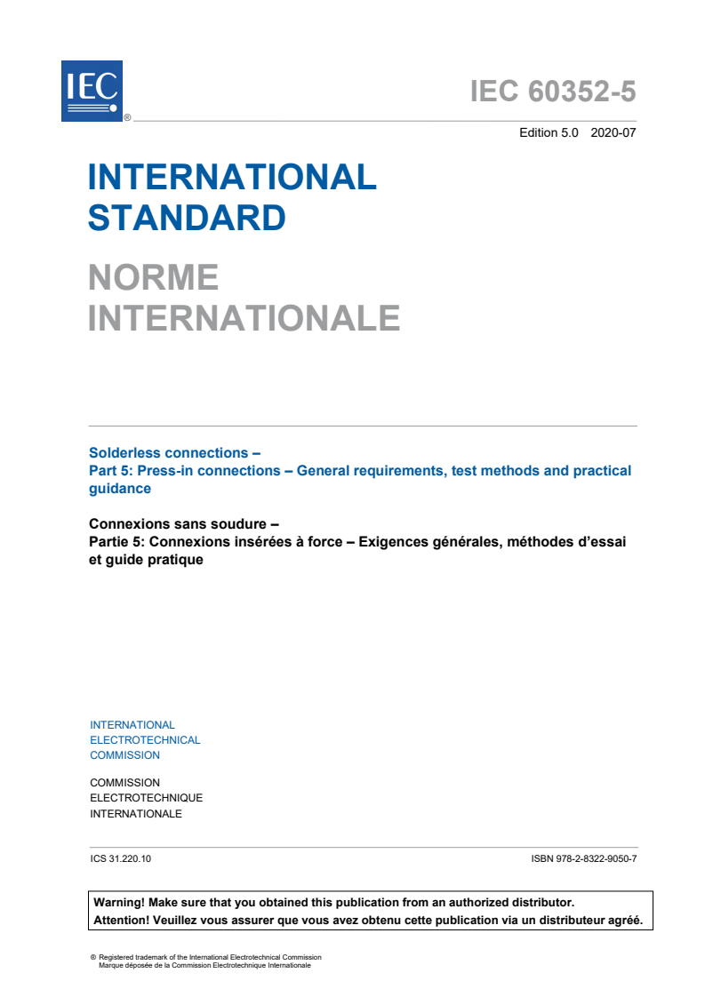 IEC 60352-5:2020 - Solderless connections - Part 5: Press-in connections - General requirements, test methods and practical guidance Released:7/22/2020