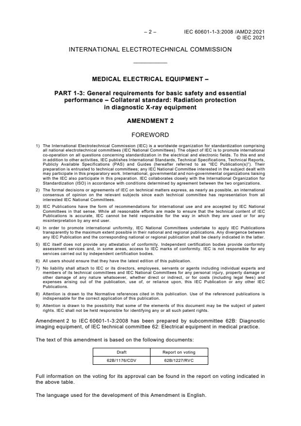 IEC 60601-1-3:2008/AMD2:2021 is a standard published by the International Electrotechnical Commission (IEC). Its full title is "Amendment 2 - Medical electrical equipment - Part 1-3: General requirements for basic safety and essential performance - Collateral Standard: Radiation protection in diagnostic X-ray equipment". This standard covers: Amendment 2 - Medical electrical equipment - Part 1-3: General requirements for basic safety and essential performance - Collateral Standard: Radiation protection in diagnostic X-ray equipment