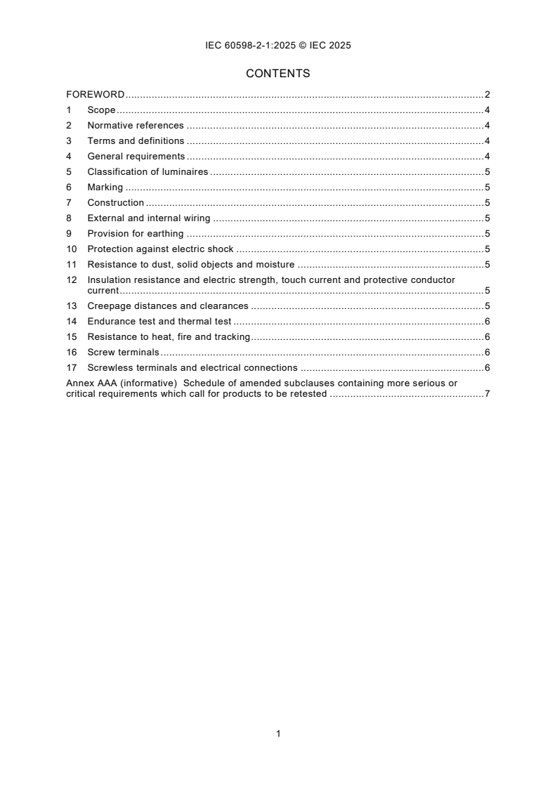 Alignment of clause numbers and document structure with IEC 60598-1 for simplified cross-reference and implementation.