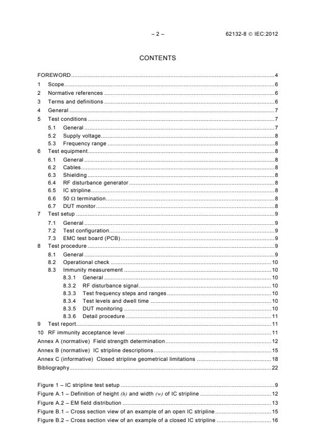 IEC 62132-8:2012 is a standard published by the International Electrotechnical Commission (IEC). Its full title is "Integrated circuits - Measurement of electromagnetic immunity - Part 8: Measurement of radiated immunity - IC stripline method". This standard covers: IEC 62132-8:2012 specifies a method for measuring the immunity of an integrated circuit (IC) to radio frequency (RF) radiated electromagnetic disturbances over the frequency range of 150 kHz to 3 GHz. This publication is to be read in conjunction with IEC 62132-1:2006.