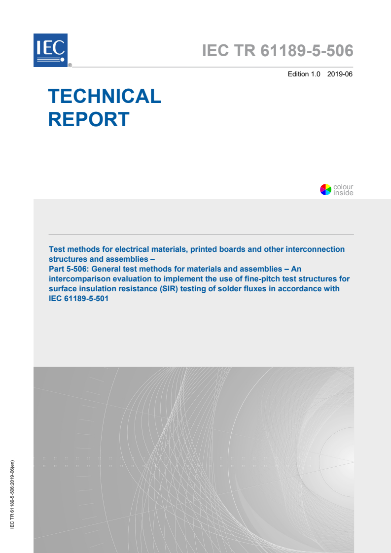 IEC TR 61189-5-506:2019 - Test methods for electrical materials, printed boards and other interconnection structures and assemblies - Part 5-506: General test methods for materials and assemblies - An intercomparison evaluation to implement the use of fine-pitch test structures for surface insulation resistance (SIR) testing of solder fluxes in accordance with IEC 61189-5-501 Released:6/26/2019