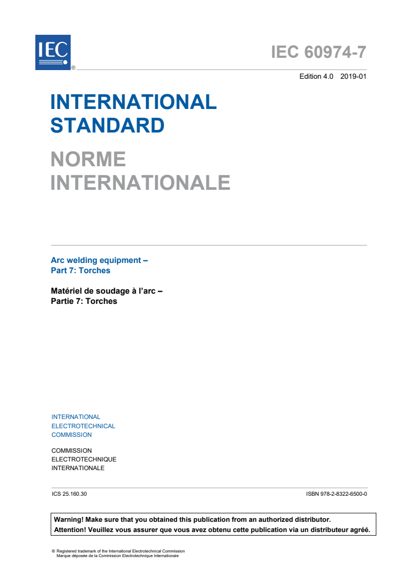 IEC 60974-7:2019 is an international standard specifying safety and construction requirements for torches used in arc welding and allied processes. Published by the International Electrotechnical Commission (IEC), this fourth edition updates and replaces the 2013 edition with enhanced technical provisions. It covers a wide range of torch types including: