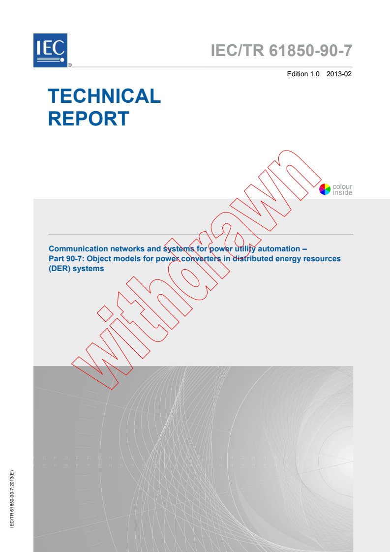 IEC TR 61850-90-7:2013 - Communication networks and systems for power utility automation - Part 90-7: Object models for power converters in distributed energy resources (DER) systems Released:2/21/2013