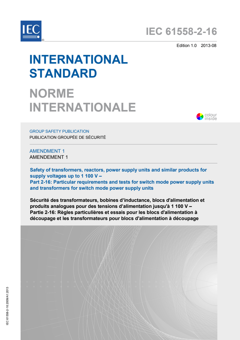 IEC 61558-2-16:2009/AMD1:2013 is a standard published by the International Electrotechnical Commission (IEC). Its full title is "Amendment 1 - Safety of transformers, reactors, power supply units and similar products for supply voltages up to 1 100 V - Part 2-16: Particular requirements and tests for switch mode power supply units and transformers for switch mode power supply units". This standard covers: Amendment 1 - Safety of transformers, reactors, power supply units and similar products for supply voltages up to 1 100 V - Part 2-16: Particular requirements and tests for switch mode power supply units and transformers for switch mode power supply units