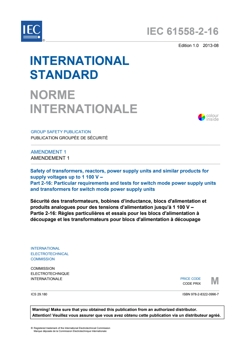 IEC 61558-2-16:2009/AMD1:2013 - Amendment 1 - Safety of transformers, reactors, power supply units and similar products for supply voltages up to 1 100 V - Part 2-16: Particular requirements and tests for switch mode power supply units and transformers for switch mode power supply units Released:8/12/2013