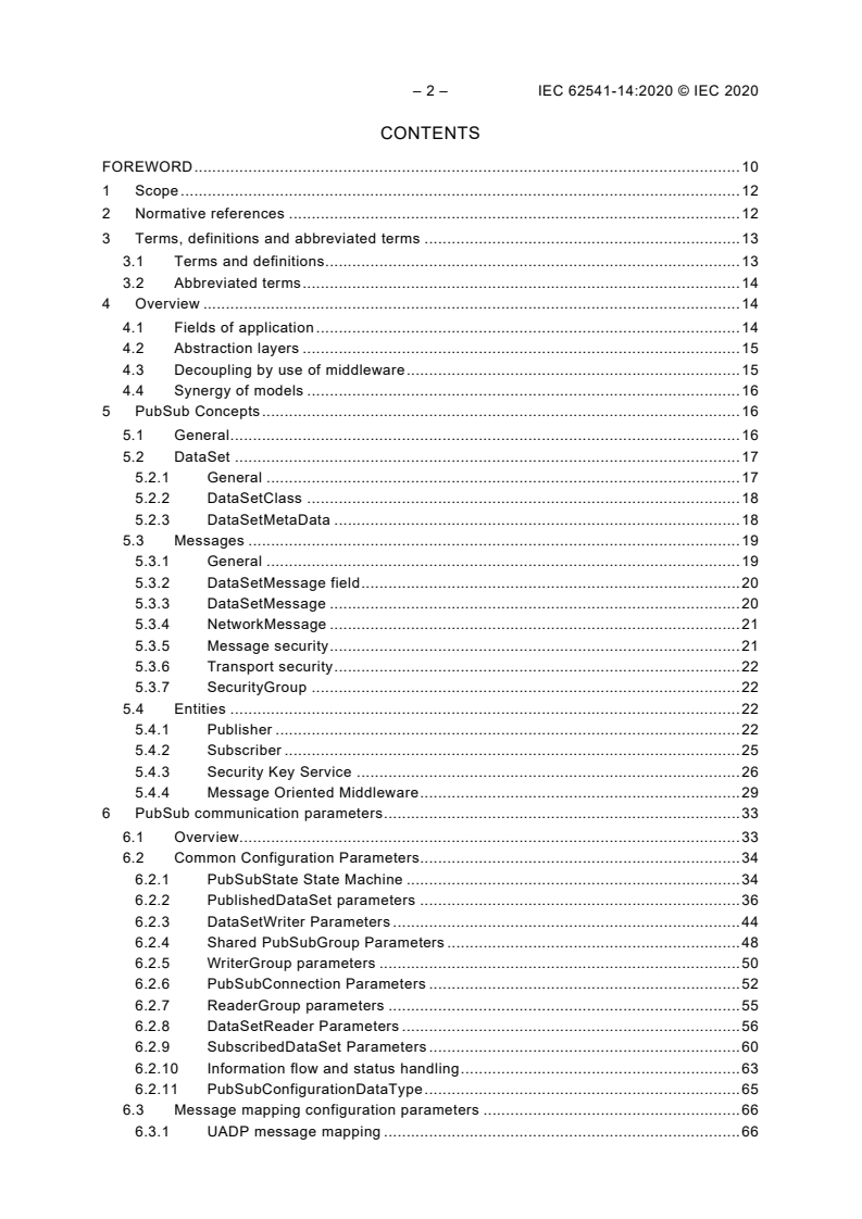 IEC 62541-14:2020 defines the OPC Unified Architecture (OPC UA) PubSub communication model. It defines an OPC UA publish subscribe pattern which complements the client server pattern defined by the Services in IEC 62541-4. IEC TR 62541-1 gives an overview of the two models and their distinct uses. PubSub allows the distribution of data and events from an OPC UA information source to interested observers inside a device network as well as in IT and analytics cloud systems. This document consists of • a general introduction of the PubSub concepts, • a definition of the PubSub configuration parameters, • mapping of PubSub concepts and configuration parameters to messages and transport protocols, and • a PubSub configuration model. Not all OPC UA Applications will need to implement all defined message and transport protocol mappings. IEC 62541-7 defines the Profile that dictates which mappings need to be implemented in order to be compliant with a particular Profile.
