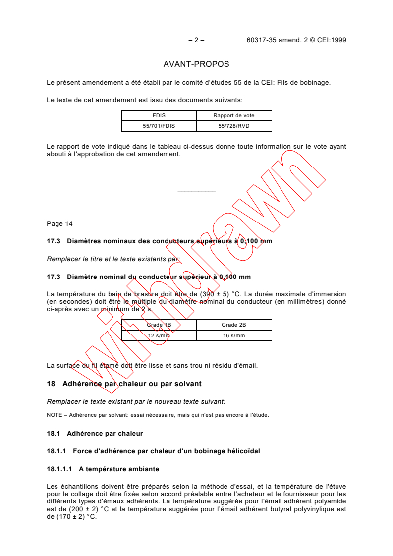 Amendement 2 - Spécifications pour types particuliers de fils de bobinage - Partie 35: Fil de section circulaire en cuivre émaillé avec polyuréthane brasable, classe 155, avec une couche adhérente