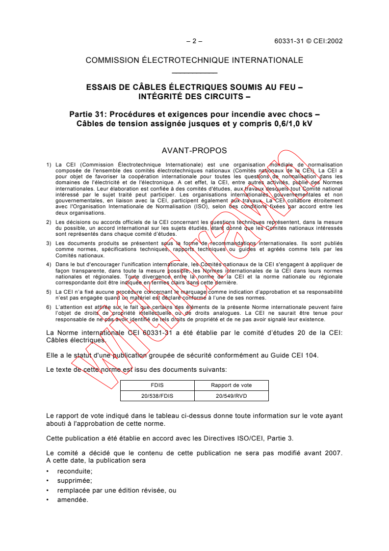 IEC 60331-31:2002 is a standard published by the International Electrotechnical Commission (IEC). Its full title is "Tests for electric cables under fire conditions - Circuit integrity - Part 31: Procedures and requirements for fire with shock - Cables of rated voltage up to and including 0,6/1 kV". This standard covers: Specifies the test procedure and gives the performance requirement, including a recommended flame application time, for cables of rated voltage up to and including 0,6/1,0 kV required to maintain circuit integrity when subjected to fire and mechanical shock under specified conditions. It is intended for use when testing cables of greater than 20 mm overall diameter. It describes the means of sample preparation, the continuity checking arrangements, the electrical testing procedure, the method of burning the cables and the method of shock production, and gives requirements for evaluating test results. Applicable to low-voltage power cables, and control cables with a rated voltage. Has the status of a group safety publication in accordance with IEC Guide 104.