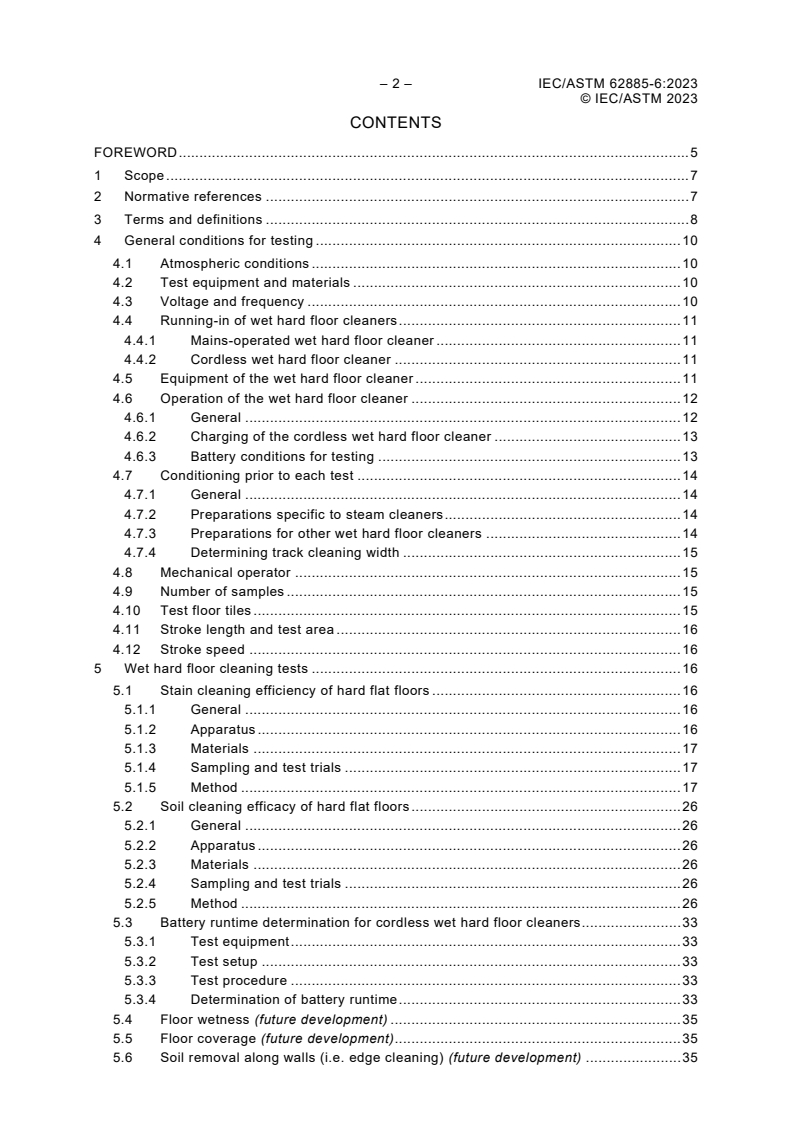IEC/ASTM 62885-6:2023 is a standard published by the International Electrotechnical Commission (IEC). Its full title is "Surface cleaning appliances - Part 6: Wet hard floor cleaning appliances for household or similar use - Methods for measuring the performance". This standard covers: IEC/ASTM 62885-6:2023 is applicable for measurements of the performance of mains-operated and cordless wet hard floor cleaning appliances for household or similar use. In the case of appliances with combined functionality, this document only addresses the wet cleaning functionality. The purpose of this document is to specify essential performance characteristics of wet hard floor cleaning appliances that are of interest to users and to describe methods for measuring these characteristics. This document is not intended for cleaning appliances according to IEC 60335-2-79 and robotic wet hard floor cleaning appliances. For safety requirements, reference is made to IEC 60335-1, IEC 60335-2-2, IEC 60335-2-10, and IEC 60335-2-54. This second edition cancels and replaces the first edition published in 2018. This edition constitutes a technical revision. This edition includes the following significant technical changes with respect to the previous edition: a) Expanded the Scope to include cordless cleaners. b) Changed definition for "cleaning width" to "track cleaning width" in 3.7 and provided instructions for determining "track cleaning width" in 4.7.4. c) Changed "runtime" definition to "battery runtime" in 3.22. d) Added IKW soil instructions, and also a penalty factor calculation with correction examples for products designed with cleaning gaps to section 5.1 "Stain cleaning efficiency of hard flat floors". e) Retitled 5.2 "Dirt pickup test" to "Soil cleaning efficacy of hard flat floors" and added comprehensive instructions for executing the method. f) Added section 5.3 "Battery runtime" procedure patterned after IEC 62885-4 cordless standard. g) Modified Test soils in 7.2.2. to add IKW and Akzo-Nobel soils. The content of the corrigendum 1 (2024-11) has been included in this copy.
