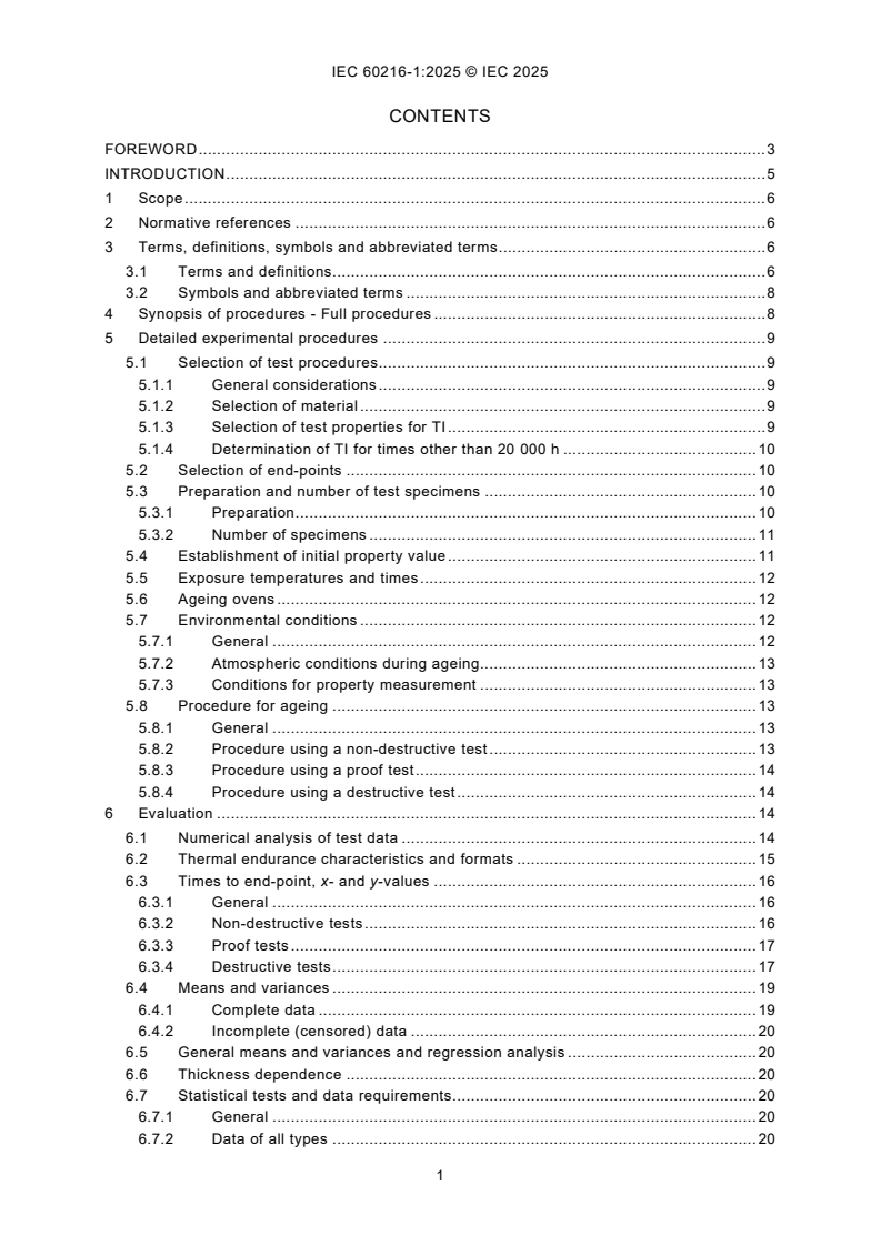 IEC 60216-1:2025 - "Electrical insulating materials - Thermal endurance properties - Part 1: Ageing procedures and evaluation of test results" specifies general ageing conditions and evaluation procedures for deriving thermal endurance characteristics of materials. Originally developed for electrical insulating materials and simple combinations, the procedures are widely used for materials not intended as electrical insulation. The standard assumes an Arrhenius-type relationship (log(time) versus 1/absolute temperature) and requires that no first-order thermal transition occurs in the tested temperature range. This part also gives guidance for using the more detailed instructions in other parts of the IEC 60216 series.