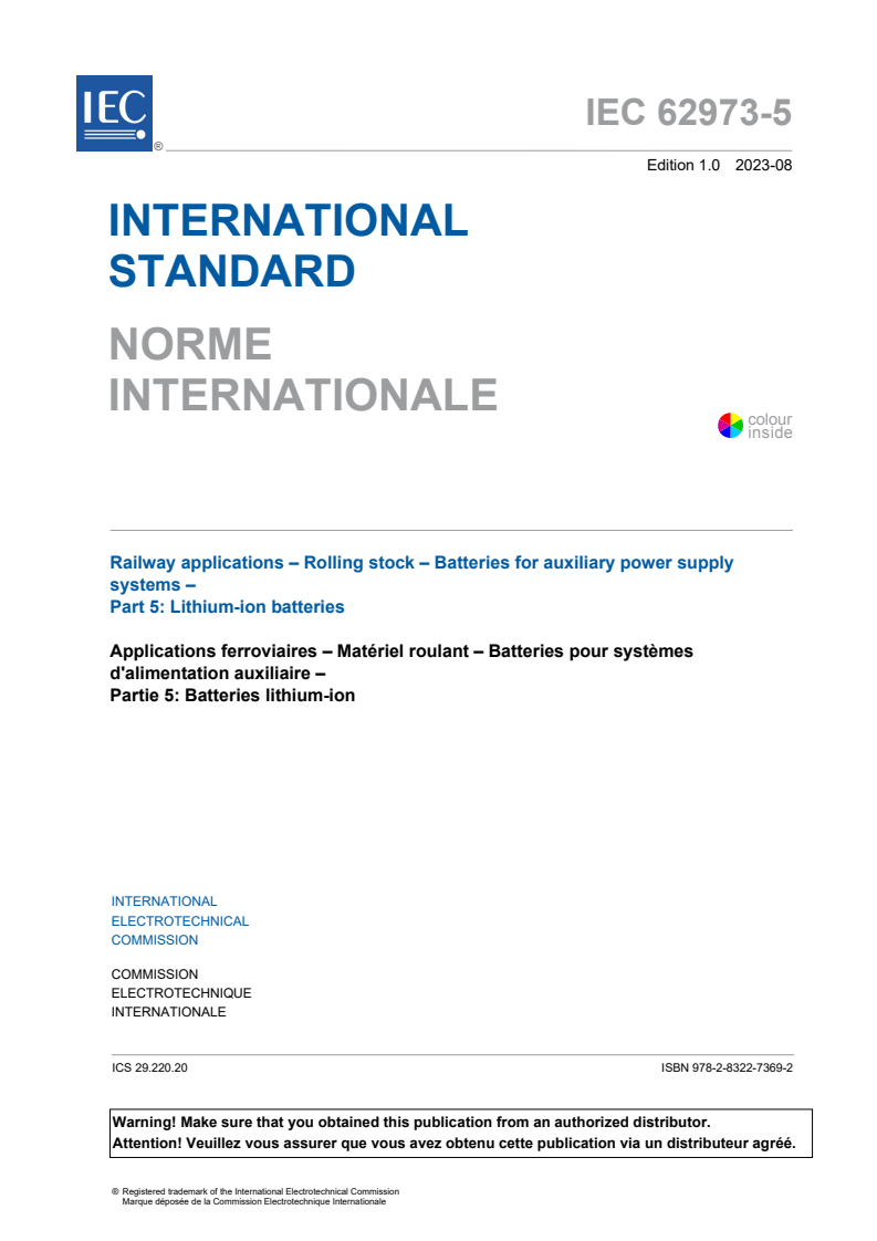 IEC 62973-5:2023 is an international standard developed by the International Electrotechnical Commission (IEC) focused on the specification of lithium-ion batteries used for auxiliary power supply systems onboard railway rolling stock. This standard specifically addresses the requirements and testing protocols for lithium-ion cells and battery systems employed across various types of trains, including light rail vehicles, trams, metros, commuter trains, high-speed trains, and locomotives.