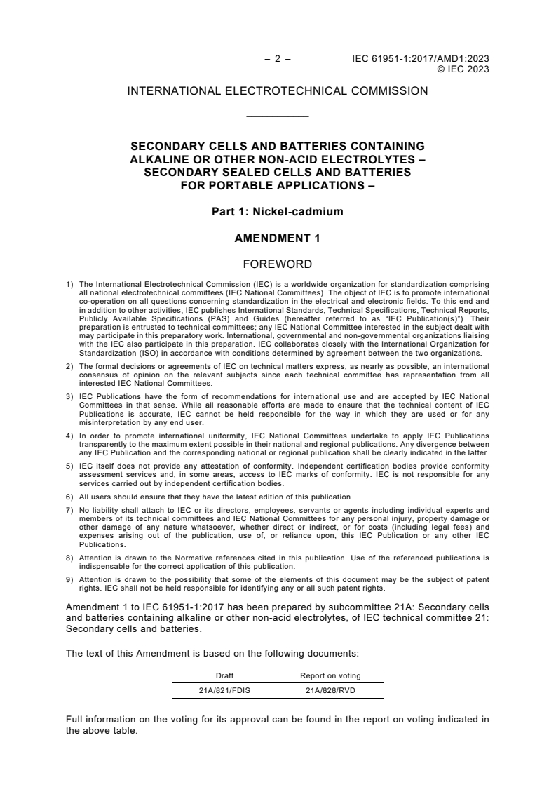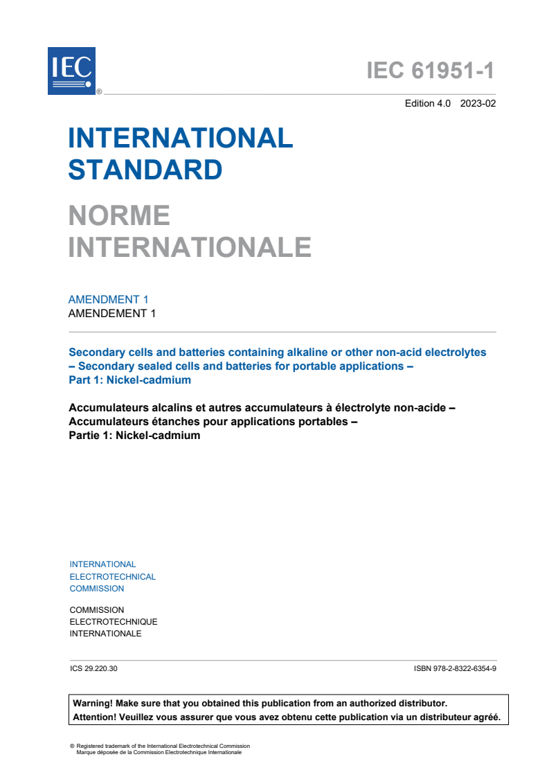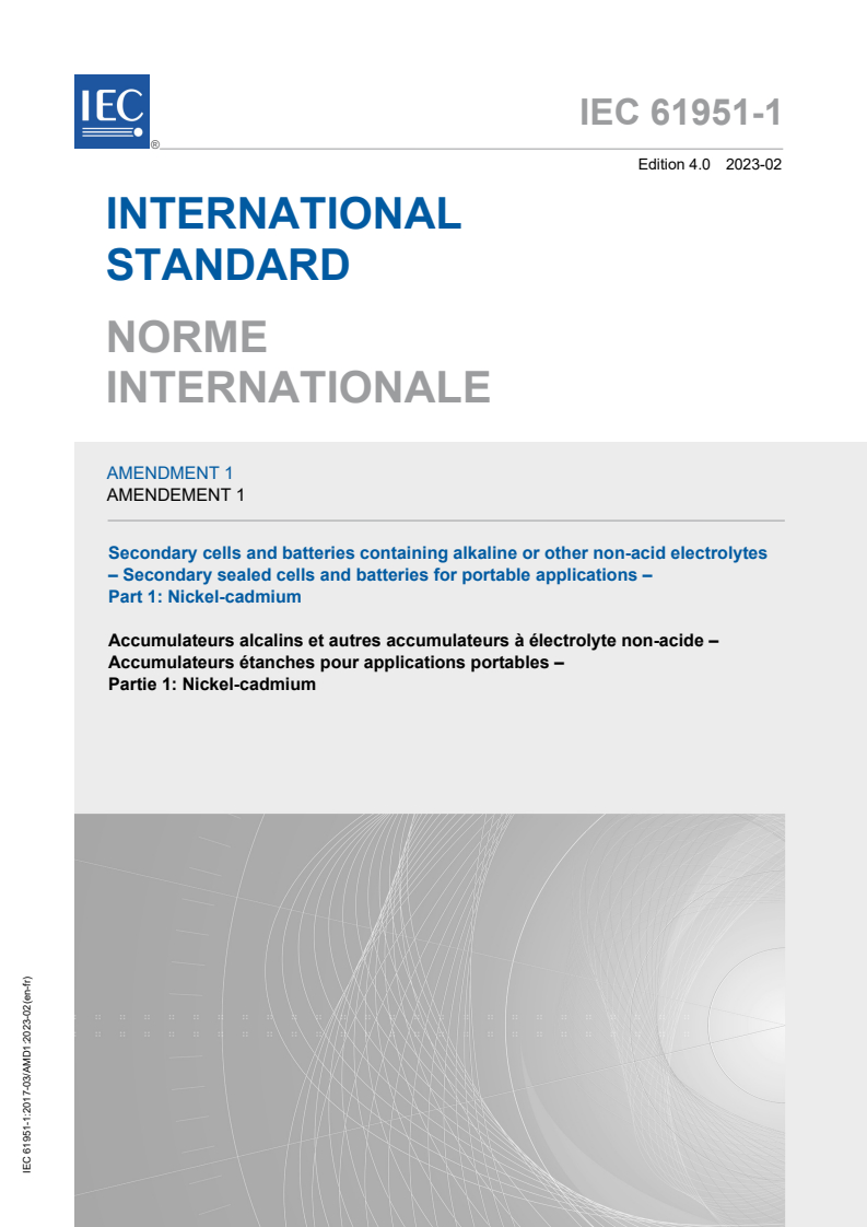 IEC 61951-1:2017/AMD1:2023 - Amendment 1 - Secondary cells and batteries containing alkaline or other non-acid electrolytes - Secondary sealed cells and batteries for portable applications - Part 1: Nickel-cadmium Released:2/6/2023