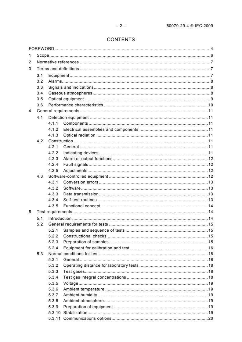 IEC 60079-29-4:2009 specifies performance requirements of equipment for the detection and measuring of flammable gases or vapours in ambient air by measuring the spectral absorption by the gases or vapours over extended optical paths, ranging typically from one meter to a few kilometres. Such equipment measures the integral concentration of the absorbing gas over the optical path in units such as LFL meter for flammable gases. This standard supplements and modifies the general requirements of IEC 60079-0. Where a requirement of this standard conflicts with a requirement of IEC 60079-0, the requirement of this standard shall take precedence. The contents of the corrigendum of August 2010 have been included in this copy.