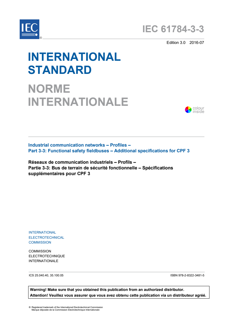 IEC 61784-3-3:2016 is an international standard developed by the International Electrotechnical Commission (IEC) focused on industrial communication networks. Specifically, it addresses functional safety fieldbuses with additional specifications for the CPF 3 family. This third edition, published in 2016, supersedes the previous 2010 edition and introduces important enhancements to the safety communication protocol used exclusively in safety devices.