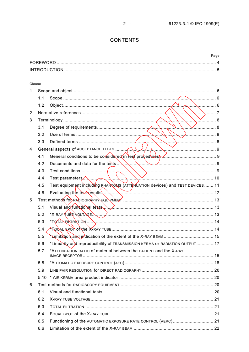 IEC 61223-3-1:1999 is a standard published by the International Electrotechnical Commission (IEC). Its full title is "Evaluation and routine testing in medical imaging departments - Part 3-1: Acceptance tests - Imaging performance of X-ray equipment for radiographic and radioscopic systems". This standard covers: Applies to those components of X-ray equipment which influence the image quality and patient dose of diagnostic X-ray systems using radiographic and radioscopic imaging systems. Defines: - the parameters which describe the performance of X-ray equipment with regard to imaging properties and patient dose; - methods of testing wether measured quantities related to those parameters comply with the specific tolerances. The aim is to verify compliance of the installation with specifications relating to the image quality and patient dose, and to detect malfunctions that are not in agreement with those specifications.