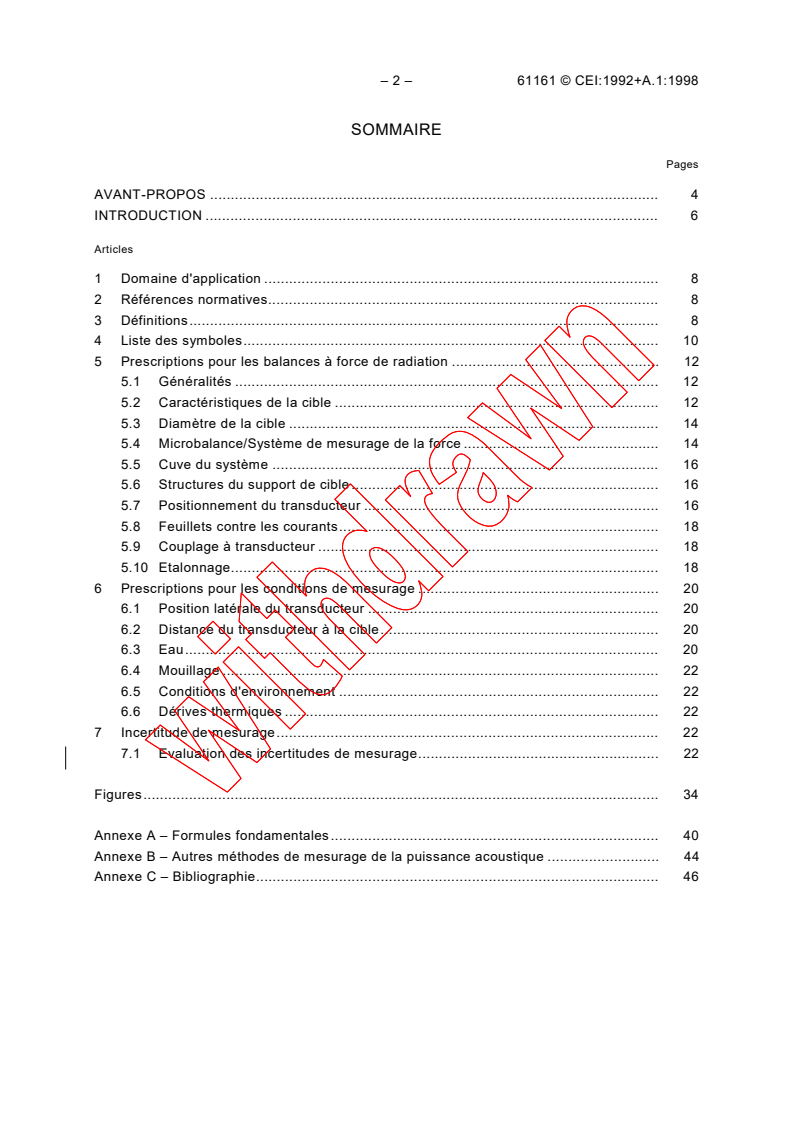 IEC 61161:1992 is a standard published by the International Electrotechnical Commission (IEC). Its full title is "Ultrasonics power measurement in liquids in the frequency range 0,5 MHz to 25 MHz". This standard covers: Specifies a method of determining the total radiated acoustic power of ultrasonic transducters based on the use of a radiation force balance. Provides general principles for the use of radiation force balances in which an obstacle (target) intercepts the sound field to be measured.
