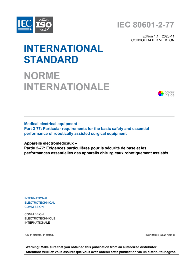 IEC 80601-2-77:2019+AMD1:2023 CSV - Medical electrical equipment - Part 2-77: Particular requirements for the basic safety and essential performance of robotically assisted surgical equipment Released:11/15/2023
