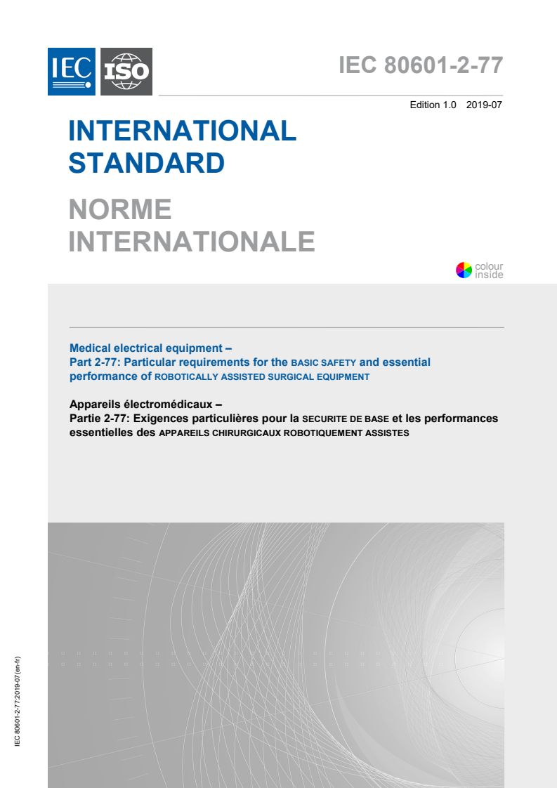 IEC 80601-2-77:2019 is a standard published by the International Electrotechnical Commission (IEC). Its full title is "Medical electrical equipment - Part 2-77: Particular requirements for the basic safety and essential performance of robotically assisted surgical equipment". This standard covers: IEC 80601-2-77:2019 applies to the BASIC SAFETY and ESSENTIAL PERFORMANCE of ROBOTICALLY ASSISTED SURGICAL EQUIPMENT (RASE) and ROBOTICALLY ASSISTED SURGICAL SYSTEMS (RASS), referred to as ME EQUIPMENT and ME SYSTEMS together with their INTERACTION CONDITIONS and INTERFACE CONDITIONS.