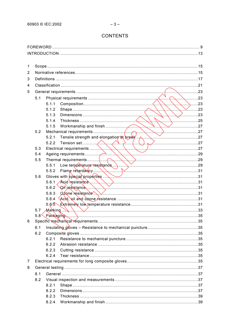 IEC 60903:2002 is a standard published by the International Electrotechnical Commission (IEC). Its full title is "Live working - Gloves of insulating material". This standard covers: Is applicable to: - insulating gloves and mitts which should normally be used in conjunction with leather protector gloves worn over the insulating gloves to provide mechanical protection; - insulating gloves and mitts usable without over-gloves for mechanical protection. Unless otherwise stated, the use of the term "glove" includes both gloves and mitts. The use of the term "insulating gloves" designates gloves providing electrical protection only. The use of the term "composite gloves" designates gloves providing electrical and mechanical protection. The contents of the corrigenda of February 2003 and January 2005 have been included in this copy.