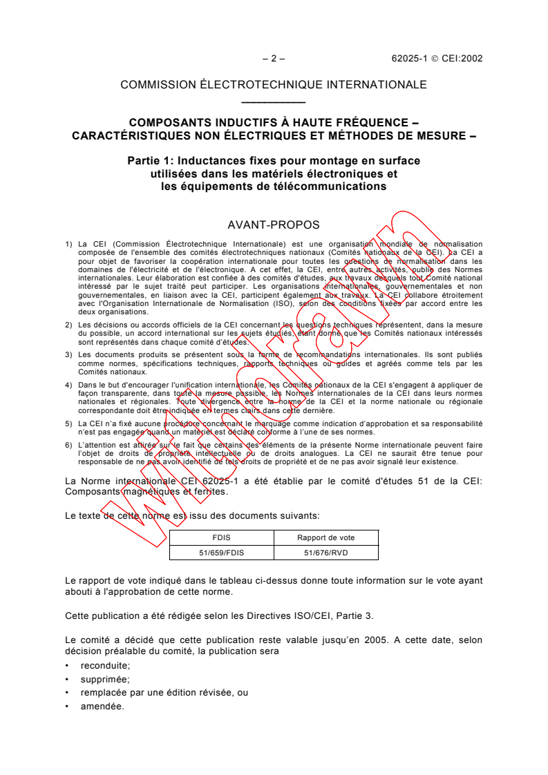IEC 62025-1:2002 is an international standard published by the International Electrotechnical Commission (IEC) that specifies requirements relating to high frequency fixed, surface mounted inductors used in electronic and telecommunication equipment. This standard focuses on the non-electrical characteristics of such inductors, including standardized terminology, outline dimensions, shape classifications, and measurement methods. It provides essential guidance for manufacturers and users on the designation, packaging, and quality control of these critical components, ensuring consistency and interoperability in electronic assemblies globally.