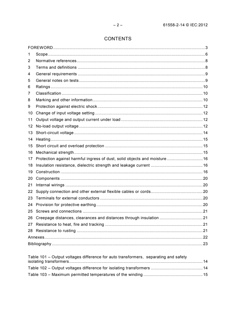 IEC 61558-2-14:2012 deals with safety of variable transformers for general applications and power supply units incorporating variable transformers for general applications. Transformers incorporating electronic circuits are also covered by this standard. This first edition cancels and replaces the chapter IV of the IEC 60989 published in 1991. It is a technical revision. This edition includes the following significant technical changes with respect to the previous edition: a) update of the existing text; b) complete editorial review. This part has the status of a group safety publication in accordance with IEC Guide 104:2010. The preparation of safety publications and the use of basic safety publications and group safety publications. The attention of National Committees is drawn to the fact that equipment manufacturers and testing organizations may need a transitional period following publication of a new, amended or revised IEC publication in which to make products in accordance with the new requirements and to equip themselves for conducting new or revised tests. It is the recommendation of the committee that the content of this publication be adopted for implementation nationally not earlier than 12 months from the date of publication. This publication is to be read in conjunction with IEC 61558-1:2005.