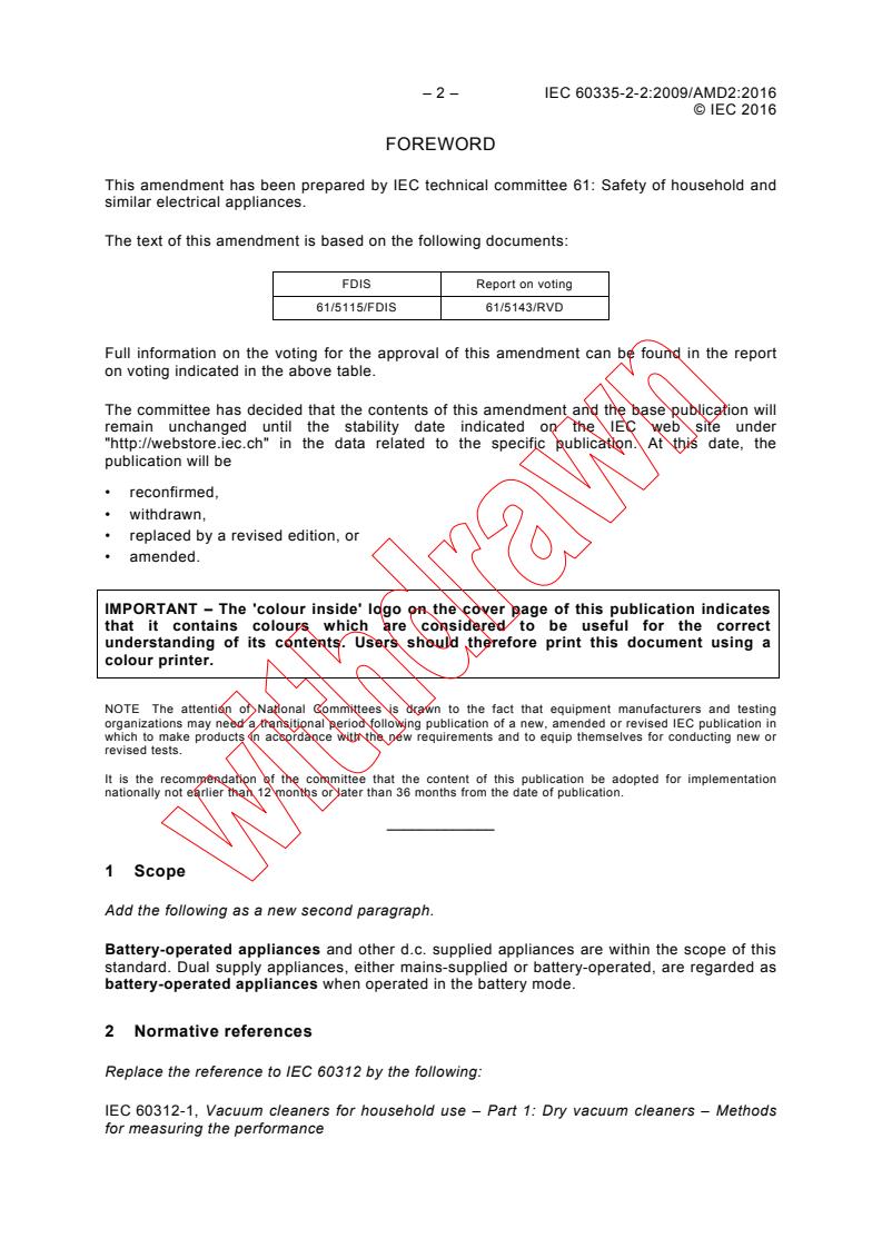IEC 60335-2-2:2009/AMD2:2016 is the Amendment 2 to the international standard IEC 60335-2-2, which focuses on the safety of household and similar electrical appliances. This particular part addresses specific safety requirements for vacuum cleaners and water-suction cleaning appliances. Developed by the International Electrotechnical Commission (IEC), this amendment provides updated guidance and testing methods to enhance the safety of these widely used electrical appliances, ensuring they comply with the highest safety standards on a global scale.