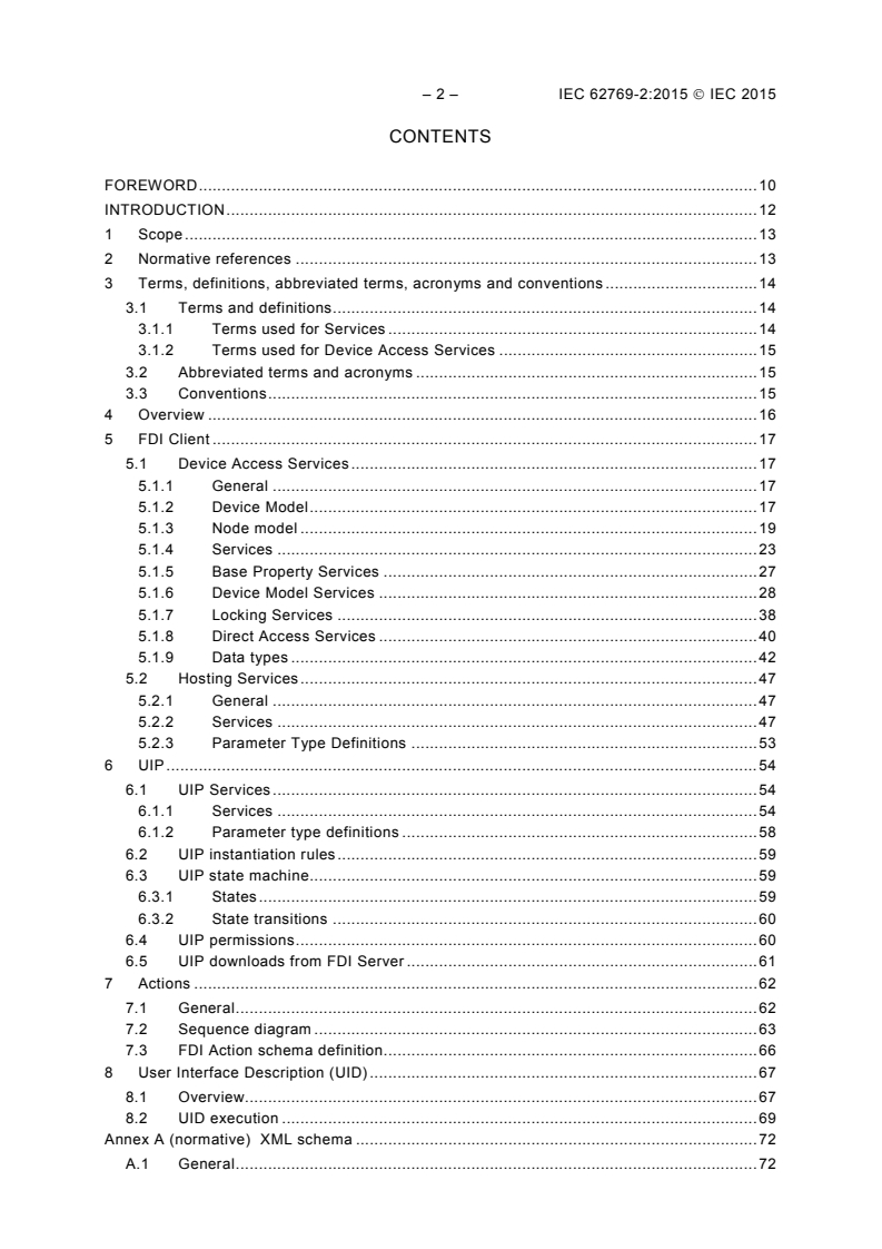 The standard defines the device access services, hosting services, User Interface Presentation (UIP) capabilities, actions, and User Interface Description (UID) necessary for an FDI Client to interact efficiently with field devices and FDI Servers.