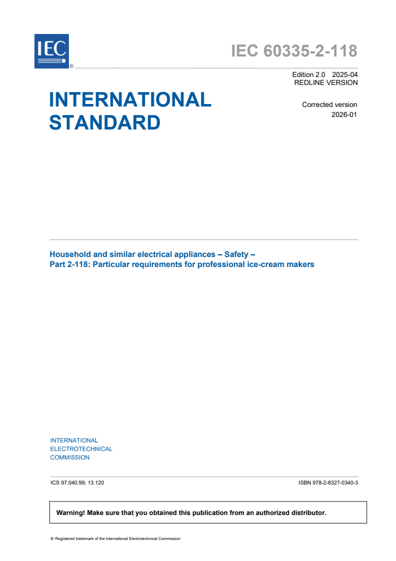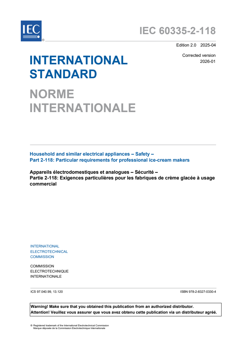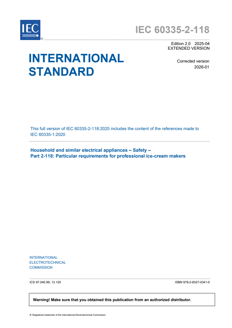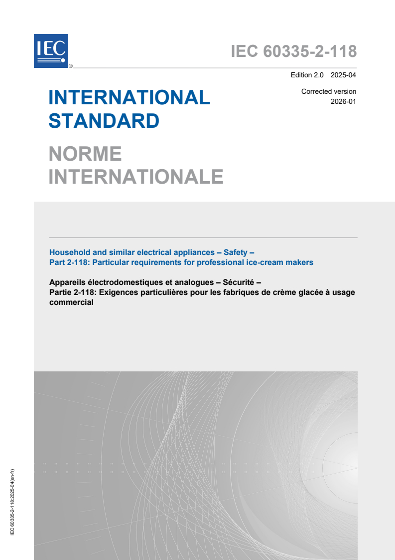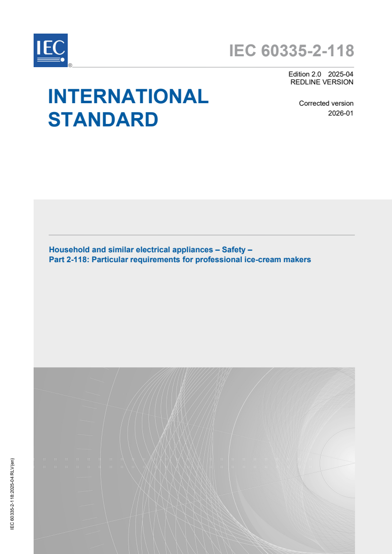 For product safety, compliance and market access of professional ice‑cream makers, IEC 60335‑2‑118:2025 is the definitive reference for harmonized technical requirements and testing.