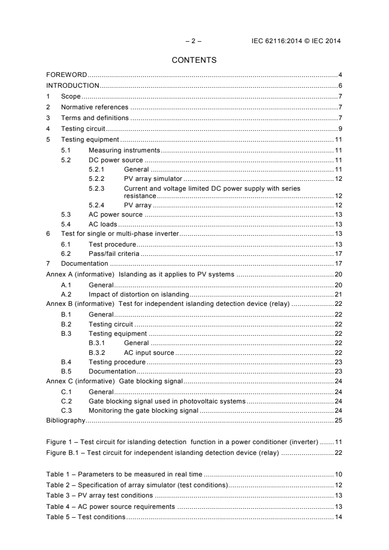 IEC 62116:2014 provides a test procedure to evaluate the performance of islanding prevention measures used with utility-interconnected PV systems. This standard describes a guideline for testing the performance of automatic islanding prevention measures installed in or with single or multi-phase utility interactive PV inverters connected to the utility grid. The test procedure and criteria described are minimum requirements that will allow repeatability. Major changes with respect to the previous edition concern the DC power source and test conditions.