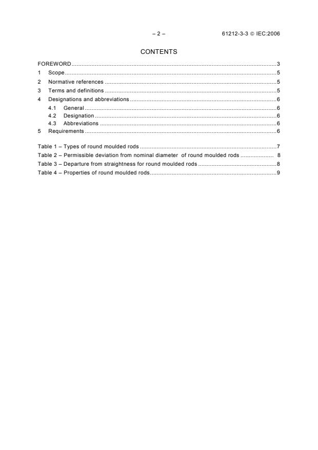 IEC 61212-3-3:2006 gives requirements for industrial rigid round laminated moulded rods for electrical purposes, based on different resins and different reinforcements. The main changes from the previous edition are as follows: added application use and safety statements. Reformatted document to bring it up to current IEC document format. Type EP GC 43 has been added.