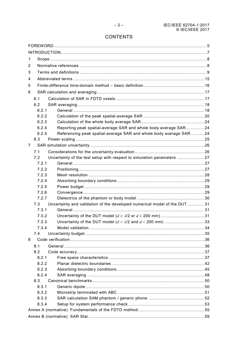 IEC/IEEE 62704-1:2017 is a standard published by the International Electrotechnical Commission (IEC). Its full title is "Determining the peak spatial-average specific absorption rate (SAR) in the human body from wireless communications devices, 30 MHz to 6 GHz - Part 1: General requirements for using the finite difference time-domain (FDTD) method for SAR calculations". This standard covers: IEC/IEEE 62704-1:2017(E) defines the methodology for the application of the finite-difference time domain (FDTD) technique when used for determining the peak spatial-average specific absorption rate (SAR) in the human body exposed to wireless communication devices with known uncertainty. It defines methods to validate the numerical model of the device under test (DUT) and to assess its uncertainty when used in SAR simulations. Moreover, it defines procedures to determine the peak spatial-average SAR in a cubical volume and to validate the correct implementation of the FDTD simulation software. The applicable frequency range is 30 MHz to 6 GHz. This document does not recommend specific SAR limits since these are found elsewhere, for example, in the guidelines published by the International Commission on Non-Ionizing Radiation Protection (ICNIRP) [1] or in IEEE Std C95.1 [3]. Key words: Spatial-Average Specific Absorption Rate, Finite-Difference Time-Domain, Human Body