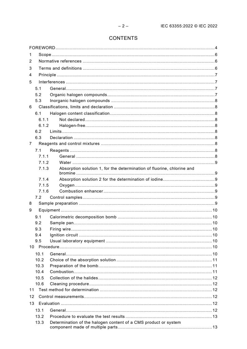 IEC 63355:2022 is a standard published by the International Electrotechnical Commission (IEC). Its full title is "Cable management systems - Test method for content of halogens". This standard covers: IEC 63355:2022 specifies a method for the determination of the content of halogens in cable management system (CMS) products or system components made completely or partly of combustible material(s). The determination is made by combustion and subsequent analysis of the combustion product by ion chromatography. This document specifies how CMS products or system components can be declared as halogen-free.