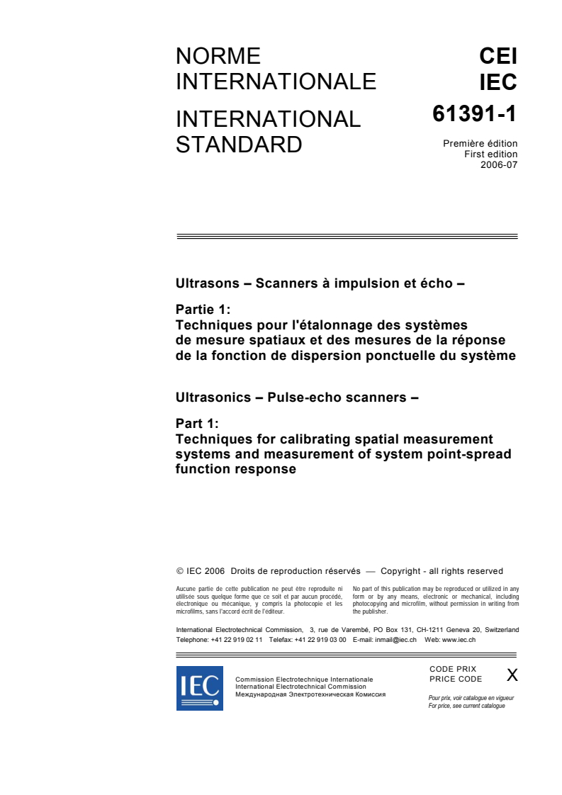 IEC 61391-1:2006 - Ultrasonics - Pulse-echo scanners - Part 1: Techniques for calibrating spatial measurement systems and measurement of system point-spread function response Released:7/11/2006