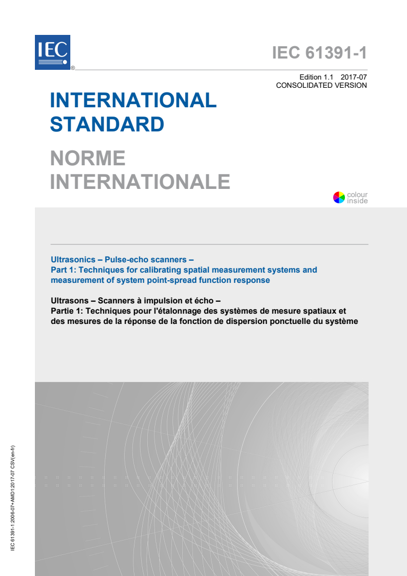 IEC 61391-1:2006 is a standard published by the International Electrotechnical Commission (IEC). Its full title is "Ultrasonics - Pulse-echo scanners - Part 1: Techniques for calibrating spatial measurement systems and measurement of system point-spread function response". This standard covers: Describes methods of calibrating the spatial measurement facilities and point-spread function of ultrasonic imaging equipment in the ultrasonic frequency range 0,5 MHz to 15 MHz. This standard is relevant for ultrasonic scanners based on the pulse echo principle of the types listed below: - mechanical sector scanners; - electronic phased-array sector scanners; - electronic linear-array scanners; - electronic curved-array sector scanners; - water bath scanners based on any of the above four scanning mechanisms; - 3D-volume reconstruction systems.