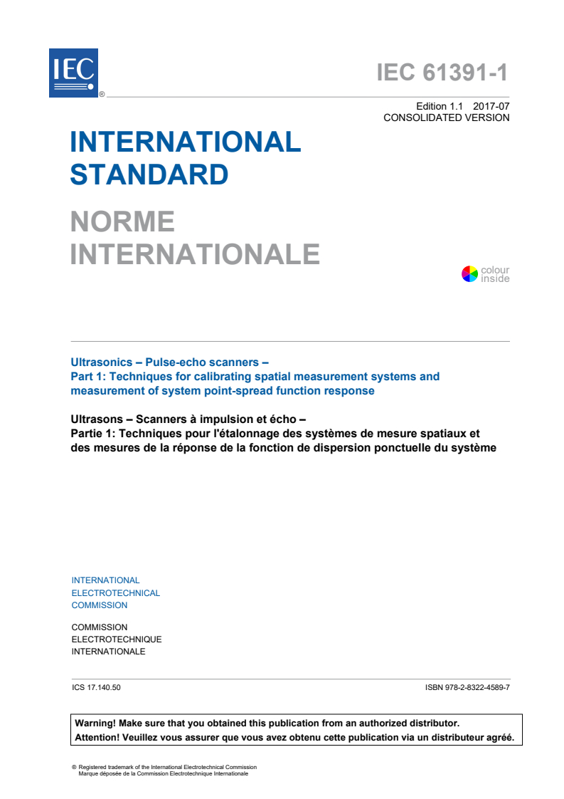 IEC 61391-1:2006+AMD1:2017 CSV - Ultrasonics - Pulse-echo scanners - Part 1: Techniques for calibrating spatial measurement systems and measurement of point-spread function response Released:7/10/2017