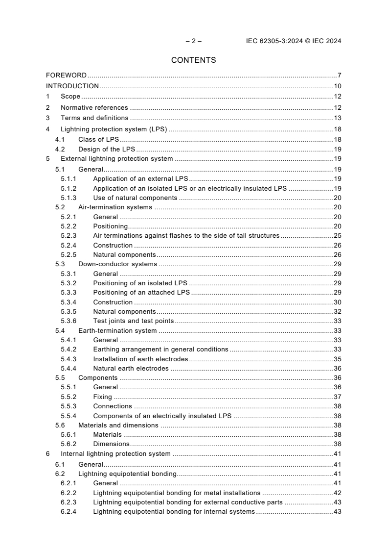 IEC 62305-3:2024 provides the requirements for protection of a structure against physical damage by means of a lightning protection system (LPS), and for protection against injury to human beings due to touch and step voltages in the vicinity of an LPS (see IEC 62305-1).