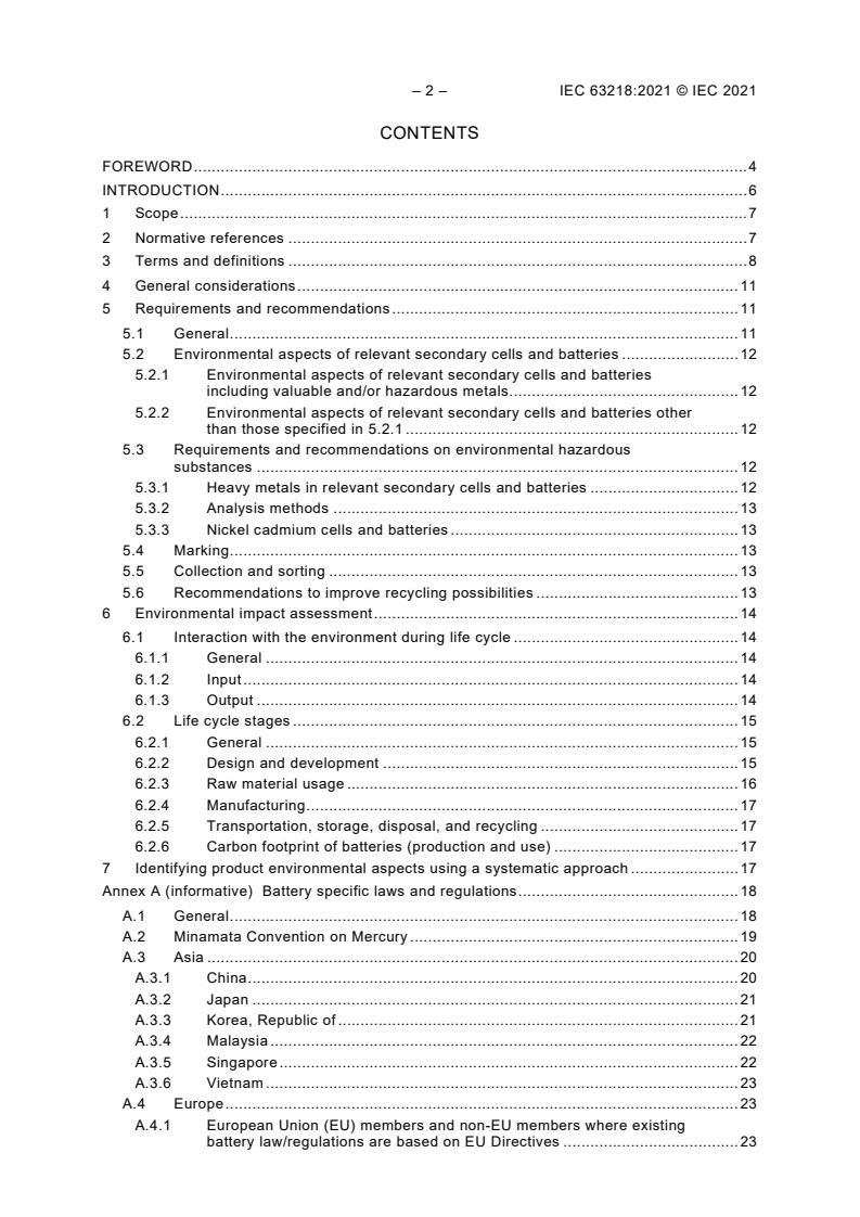 IEC 63218:2021 provides requirements and recommendations on environmental aspects of secondary lithium, nickel cadmium and nickel-metal hydride cells and batteries for portable applications (hereafter referred to as “relevant secondary cells and batteries”).