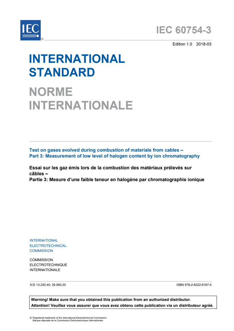 IEC 60754-3:2018 - Test on gases evolved during combustion of materials from cables - Part 3: Measurement of low level of halogen content by ion chromatography Released:3/19/2018