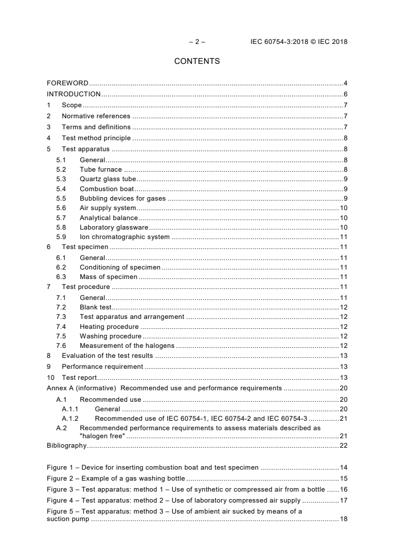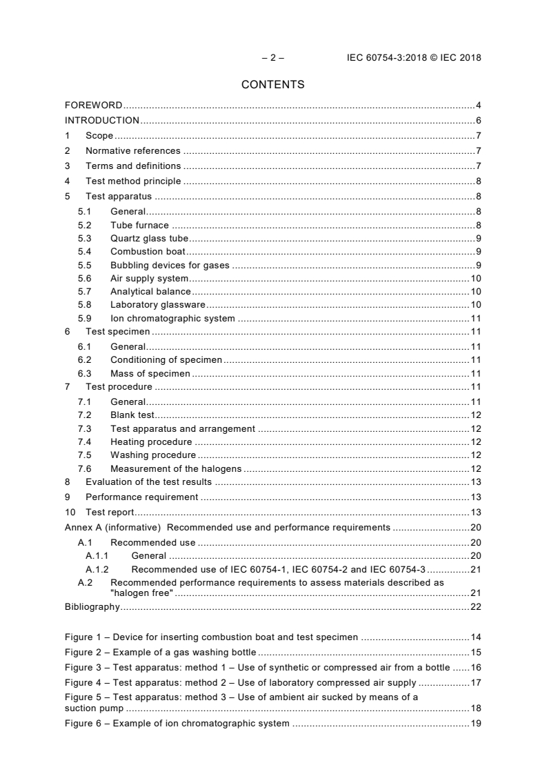 IEC 60754-3:2018 specifies the apparatus and procedure for the measurement of the amount of halogens evolved during the combustion of materials taken from electric or optical fibre cable constructions.