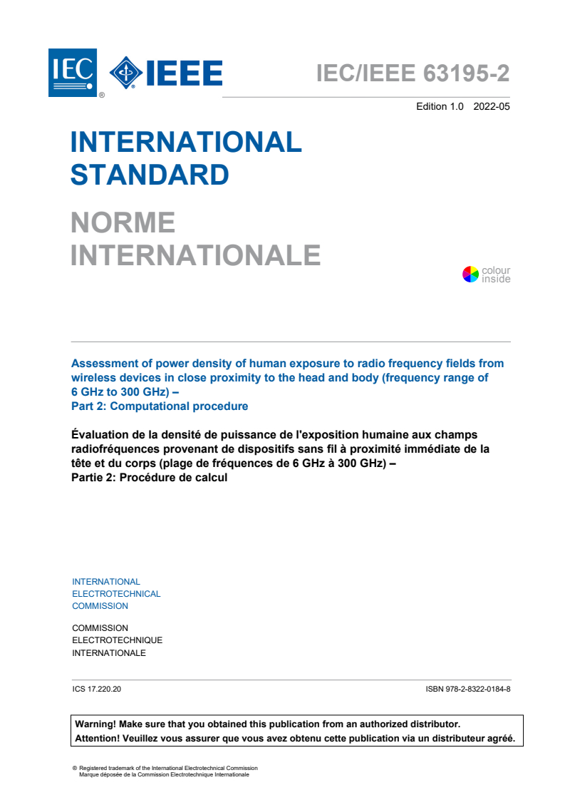 IEC/IEEE 63195-2:2022 - Assessment of power density of human exposure to radio frequency fields from wireless devices in close proximity to the head and body (frequency range of 6 GHz to 300 GHz) - Part 2: Computational procedure Released:5/11/2022