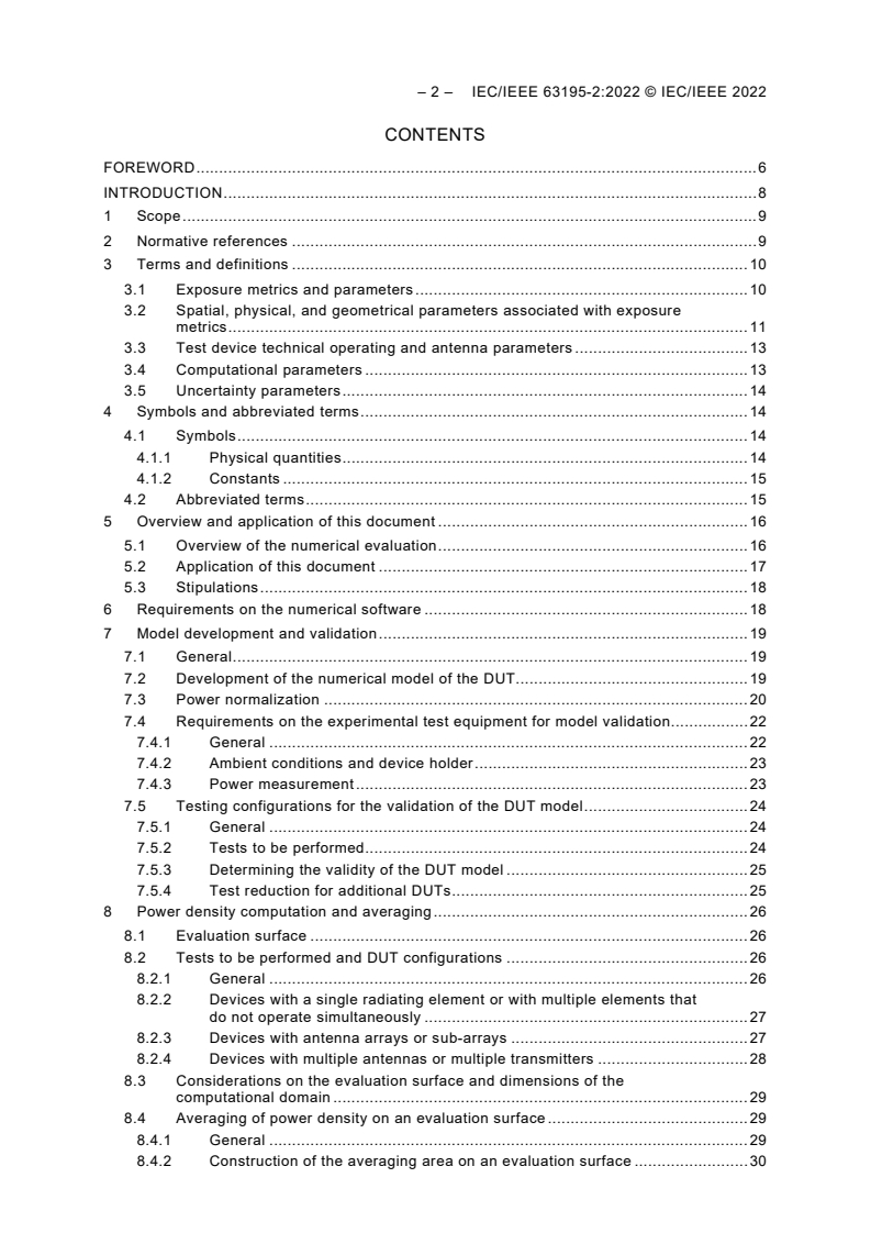 IEC/IEEE 63195-2:2022 specifies computational procedures for conservative and reproducible computations of power density (PD) incident to a human head or body due to radio-frequency (RF) electromagnetic field (EMF) transmitting devices. The computational procedures described are finite-difference time-domain (FDTD) and finite element methods (FEM), which are computational techniques that can be used to determine electromagnetic quantities by solving Maxwell’s equations within a specified computational uncertainty. The procedures specified here apply to exposure assessments for a significant majority of the population during the use of hand-held and body-worn RF transmitting devices. The methods apply to devices that can feature single or multiple transmitters or antennas, and that can be operated with their radiating part or parts at distances up to 200 mm from a human head or body. This document can be employed to determine conformity with any applicable maximum PD requirements of different types of RF transmitting devices used in close proximity to the head and body, including those combined with other RF transmitting or non-transmitting devices or accessories (e.g. belt-clip), or embedded in garments. The overall applicable frequency range of these protocols and procedures is from 6 GHz to 300 GHz. The RF transmitting device categories covered in this document include but are not limited to mobile telephones, radio transmitters in personal computers, desktop and laptop devices, and multi-band and multi-antenna devices. The procedures of this document do not apply to PD assessment of electromagnetic fields emitted or altered by devices or objects intended to be implanted in the body. NOTE For the assessment of the combined exposure from simultaneous transmitters at frequencies below 6 GHz, the relevant standards for SAR computation are IEC/IEEE 62704-1:2017 and IEC/IEEE 62704-4:2020. This publication is published as an IEC/IEEE Dual Logo standard.