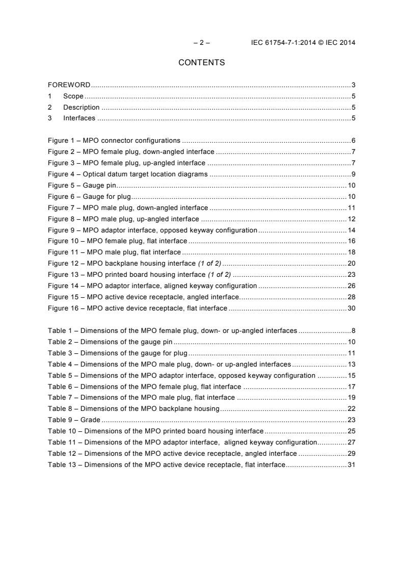 IEC 61754-7-1:2014 définit les dimensions d’interface normales pour la famille de connecteurs de type MPO à une rangée de fibres. Cette première édition de l’IEC 61754-7-1, conjointement avec la première édition de l’IEC 61754-7-2, annule et remplace la troisième édition de l’IEC 61754-7 parue en 2008. Cette première édition de l’IEC 61754-7-1 traite des variantes MPO à une rangée de fibres, ainsi que des embases de dispositif actif et de fiches angulaires vers le haut. La première édition de l’IEC 61754-7-2 traitera des variantes MPO à deux rangées de fibres et des embases de dispositif actif et de fiches angulaires vers le haut associées. A la suite de la publication de l’IEC 61754-7-1 et de l’IEC 61754-7-2, l’IEC 61754-7 sera supprimée.