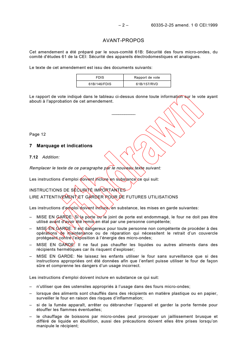 Cet amendement a été préparé par le sous-comité 61B: Sécurité des fours micro-ondes, du